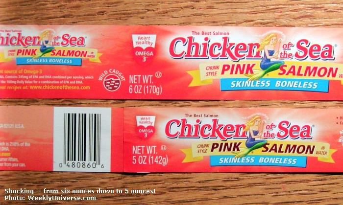 The Weekly Universe first reported on this phenomenon two years ago, when it exposed Chicken of the Sea's downsizing of their "Chunk Style Pink Salmon in Water -- Skinless Boneless" from 6 oz cans to 5 oz cans -- with no discernable price drop!