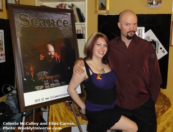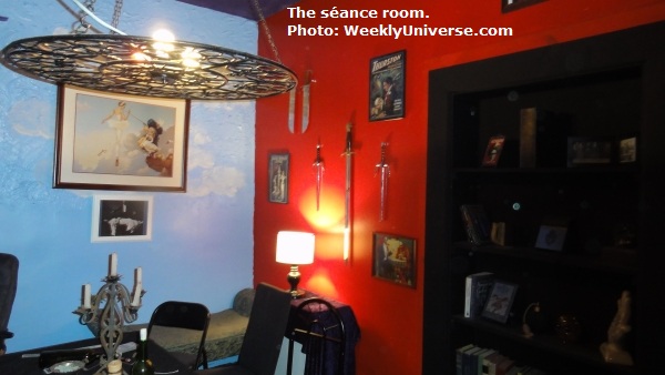 Caress's assistant, the voluptuous Celeste McCulley, welcomed the truth seekers, then led them into a cramped room in the back of the house. Swords, posters, and mystical paraphernalia hung from the walls of many colors. The table was adorned with occult tools -- dowsing rods (aka divining rods when used for seeking ghosts rather than water), bells, tarot cards, Zener cards, candles, and pendulums.
