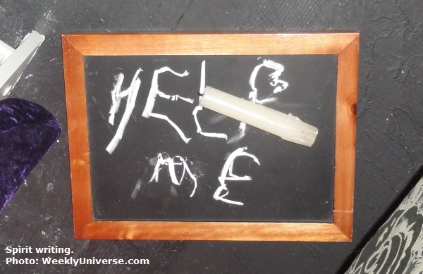 [WeeklyUniverse.com] Six explorers of the supernatural realms made an astonishing breakthrough, at the home of spiritualist medium Elias Caress, when their séance was disrupted by an angry spirit -- or spirits! -- one of whom left behind a desperate plea for help as evidence of its visitation!